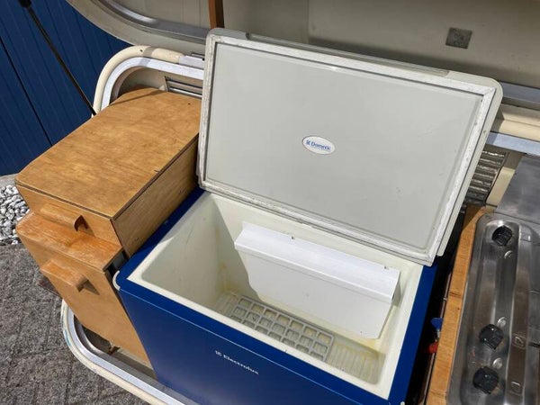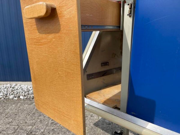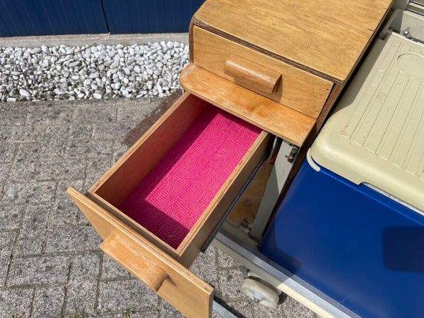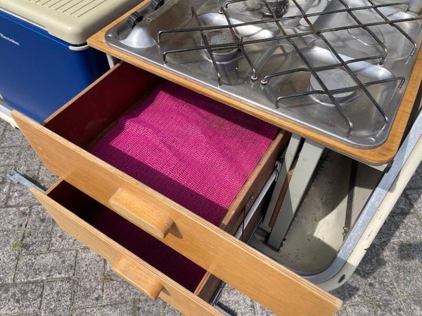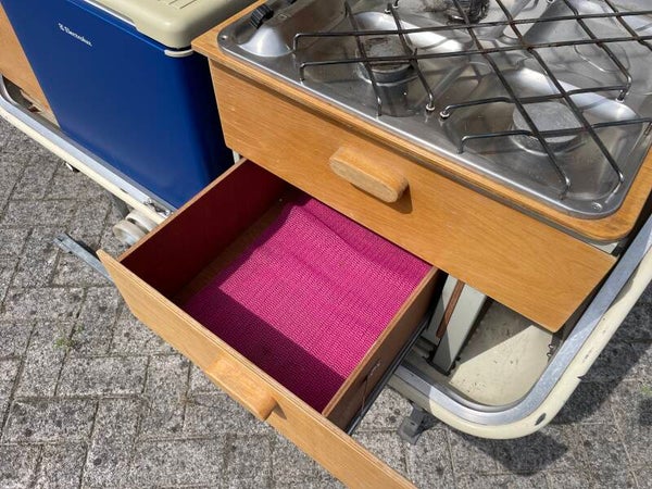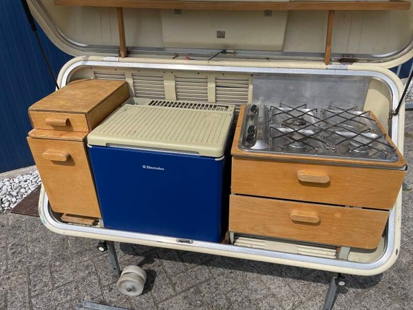 De keuken is voorzien van een 3-pits gascomfoor, veel bergruimte (unieke lades!) en een kruidenrekje. De deksel van de keuken is met een sleutel afsluitbaar. Dankzij de gepatenteerde wielconstructie rijd je de keuken zo van de dissel af.
