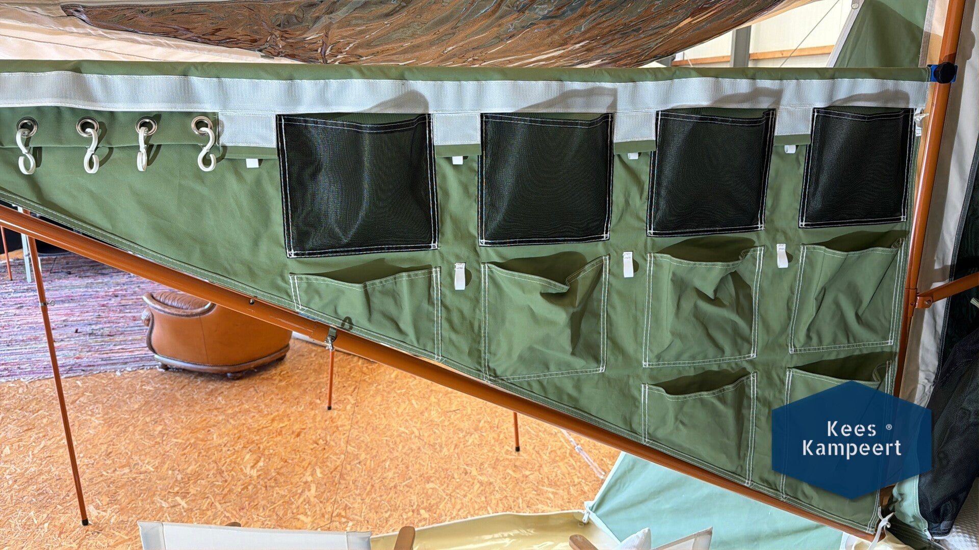 Je plaatst de Doorsnee links of rechts in de Woonkamer van je Kees Kampeert Numero Dertien, boven het schuinlopende tentframe en je gebruikt hiervoor een RVS-stang met blauwe griijpers. Deze stang heb je al, maar als je tegelijkertijd de voorwand als boerendeur wilt gebruiken, dan heb je een 2e stang nodig.