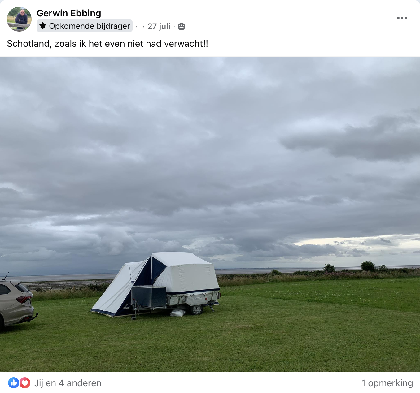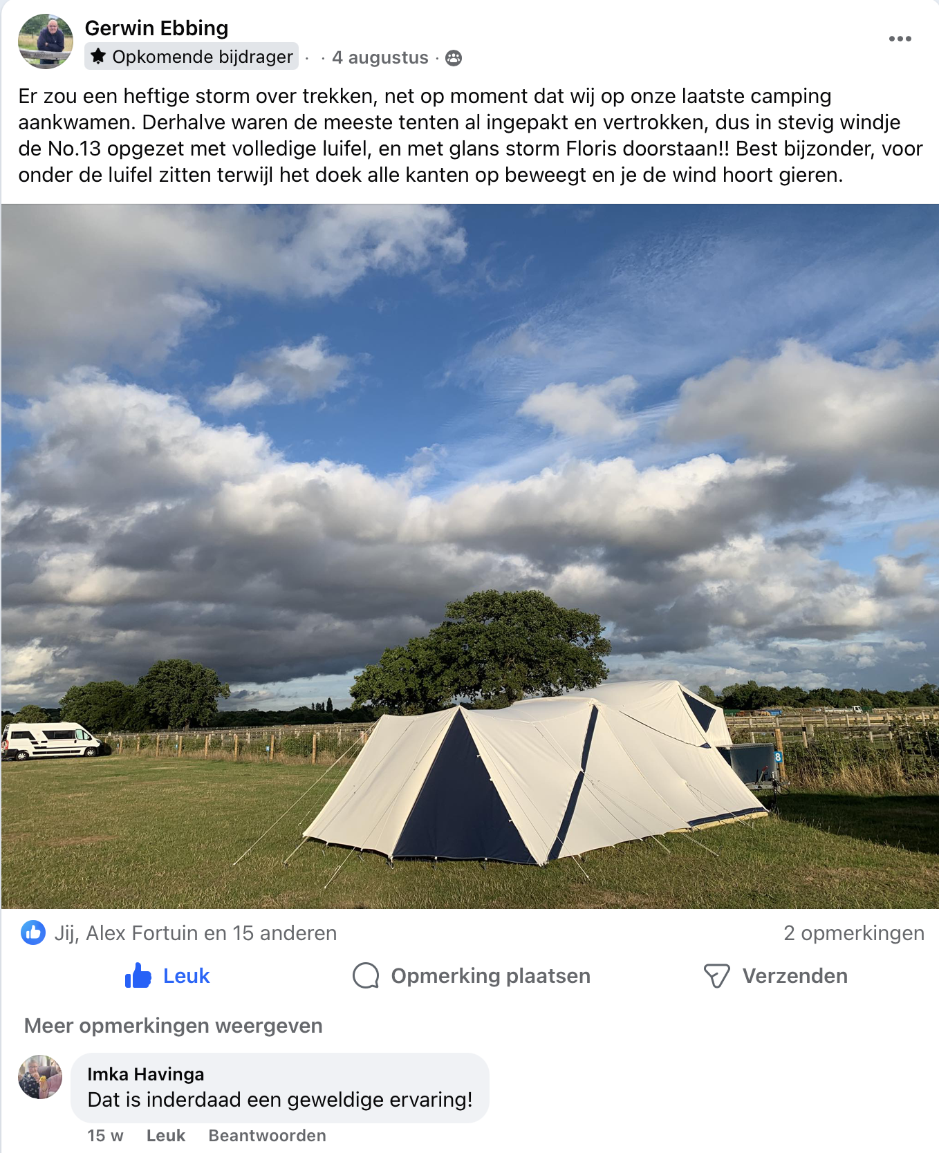 "Sinds kort hebben wij een Numero 13 op de oprit staan. We hebben hem ongezien gekocht (wel de filmpjes gezien natuurlijk) en hij werd netjes bezorgd. We komen van een De Waard en willen minder tijd kwijt zijn met op- en afbreken, maar wel de voordelen van De Waard behouden (lekker slapen onder katoenen doek en relaxen onder de grote luifel). De ervaringen zijn erg goed."